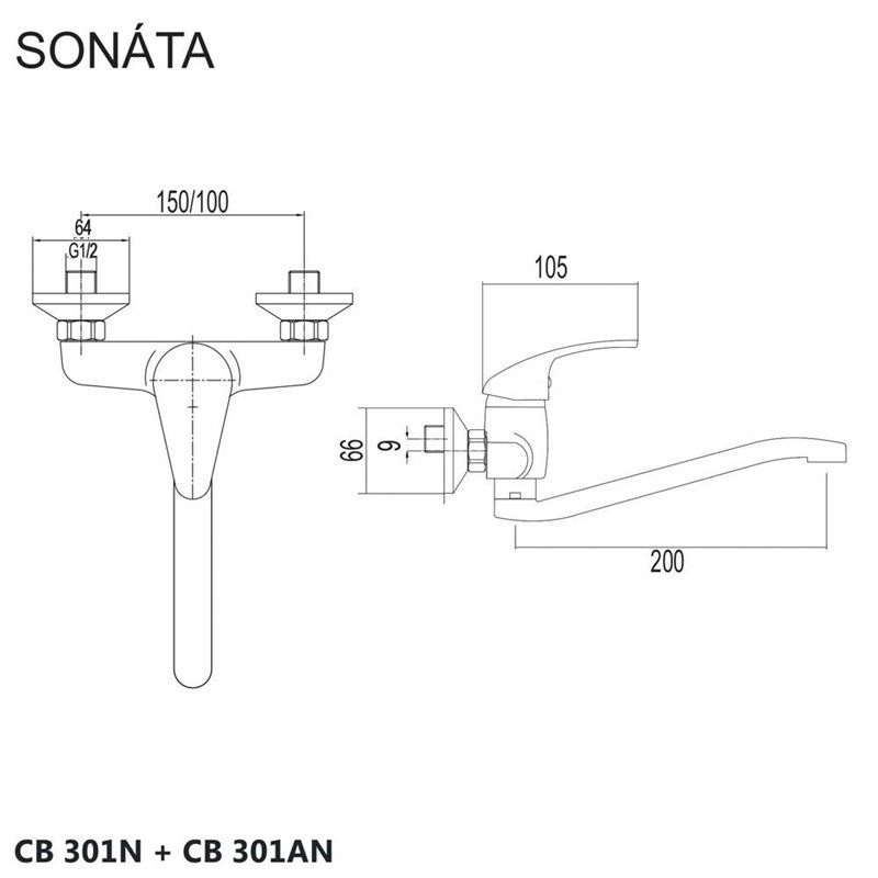 - Drezová nástenná batéria, Sonáta, 100 mm, s ramienkom plochým vyhnutým 210 mm, chróm