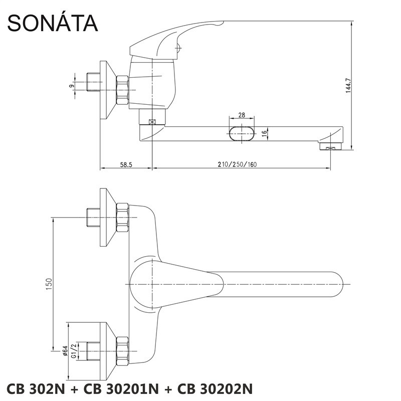 - Drezová nástenná batéria, Sonáta, 150 mm, s ramienkom plochým rovným 210 mm, chróm
