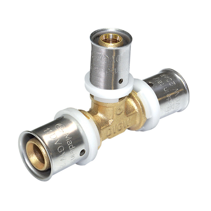 Kvalitný mosadzný lisovací T-kus určený na rozvetvenie alebo prepojenie plast-hliníkového (PEx/Al/PEx). T-kus vytvára pevné, tesné a trvácne spojenie bez potreby dodatočného tesnenia či závitových spojov. Vyrobený z odolnej mosadze s povrchovou ochranou proti korózii, ktorá zaručuje dlhú životnosť, vysokú pevnosť a spoľahlivú tesnosť spoja. Vhodný pre rozvody vody a kúrenia v domácnostiach aj priemyselných systémoch.