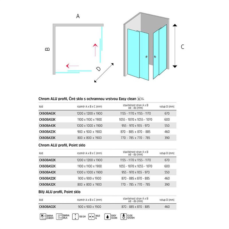 Ľahké otváranie a nastavenie zabezpečujú nastaviteľné ložiskové pojazdy (dvojkolieskami). Jednoduchú údržbu a možnosť vyčistiť aj tá najmenej prístupné miesta kúta potom zaisťujú spodné pojazdy s pružinovým mechanizmom, pre ľahké vysadenie posuvné časti z rámu.