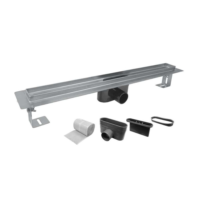Odtokové žľaby Slim s možnosťou zníženia výšky sifónu, výškovo nastaviteľné nožičky, rošt Tile, nerezová oceľ