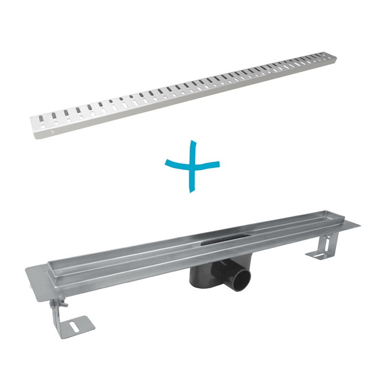 Odtokové žľaby Slim s možnosťou zníženia výšky sifónu, výškovo nastaviteľné nožičky, rošt Wave, nerezová oceľ