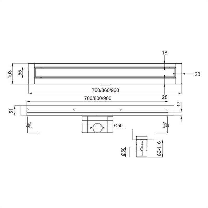 - Odtokový sprchovací žľab k stene, 700 x 55 mm, vr. roštu Strip, nerez
