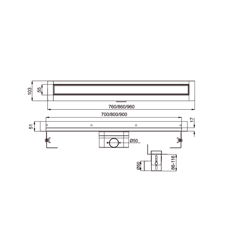 - Odtokový sprchový žľab 90x5,5 cm k stene, bez roštu, nerez