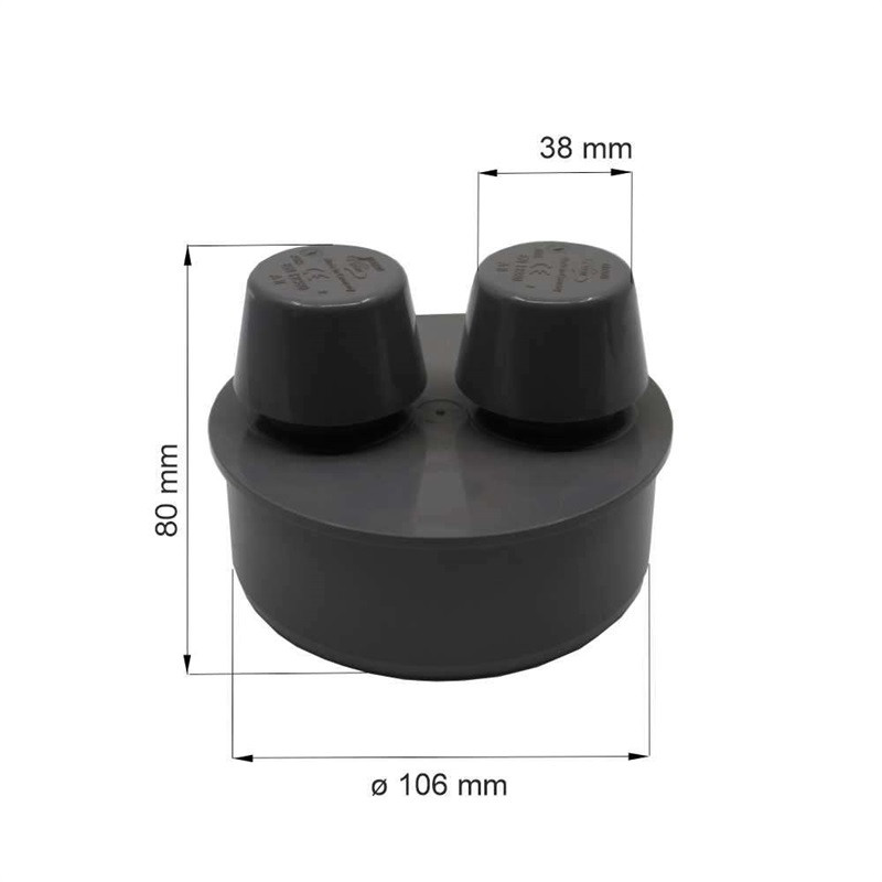 Privzdušňovací ventil potrubia triedy AII pre privzdušnenie odpadového potrubia. Zamedzuje prestupu zápachu z odpadového potrubia. Umožňuje prisávanie vzduchu do odpadového potrubia pri podtlaku v systéme. Prietok 2 l/s - 3,3 l/s. Teplotný použitie: 0° C - + 60° C.