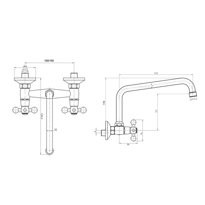- Retro Viktorie batéria drezová, nástenná, 150 mm, s U ramienkom rúrkovým o 18 mm - 230 mm