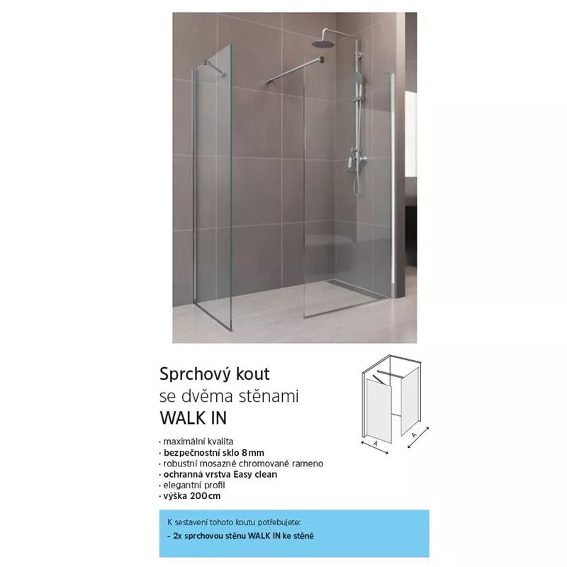 Sprchové steny WALK IN sú jediné, ktoré sa vám naozaj prispôsobí. Zostavte si svoj sprchovací priestor na mieru. Sprchovací kút typu WALK IN si môžete poskladať v niekoľkých možných kombináciách. Stabilitu bezpečnostné skla zaisťuje elegantná kovová vzpera a v prípade montáže na stenu i bočný nastaviteľný profil, ktorý nenarúša dizajnovú čistotu celého kúta, nejedná sa však o hermeticky uzavretý výrobok.