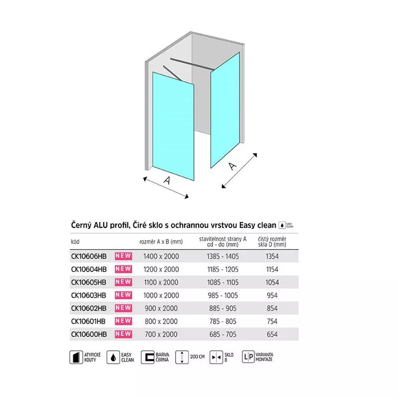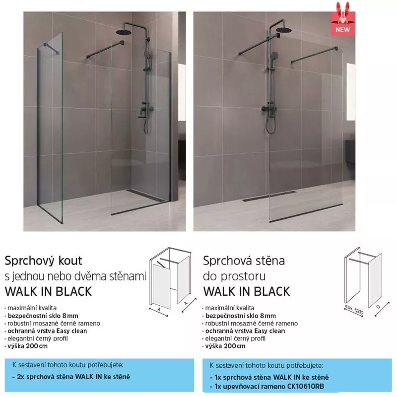 - Sprchová stena WALK IN, Novea, 110 x 2000 cm, black ALU, sklo Číre