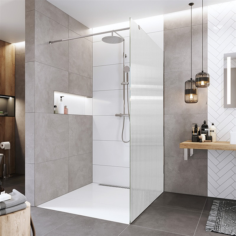 Hliníkové profily vo farbe chróm, sklo LINE, hrúbka skla 8 mm, WALK IN, rozmer 700 mm, výška 2000 mm.