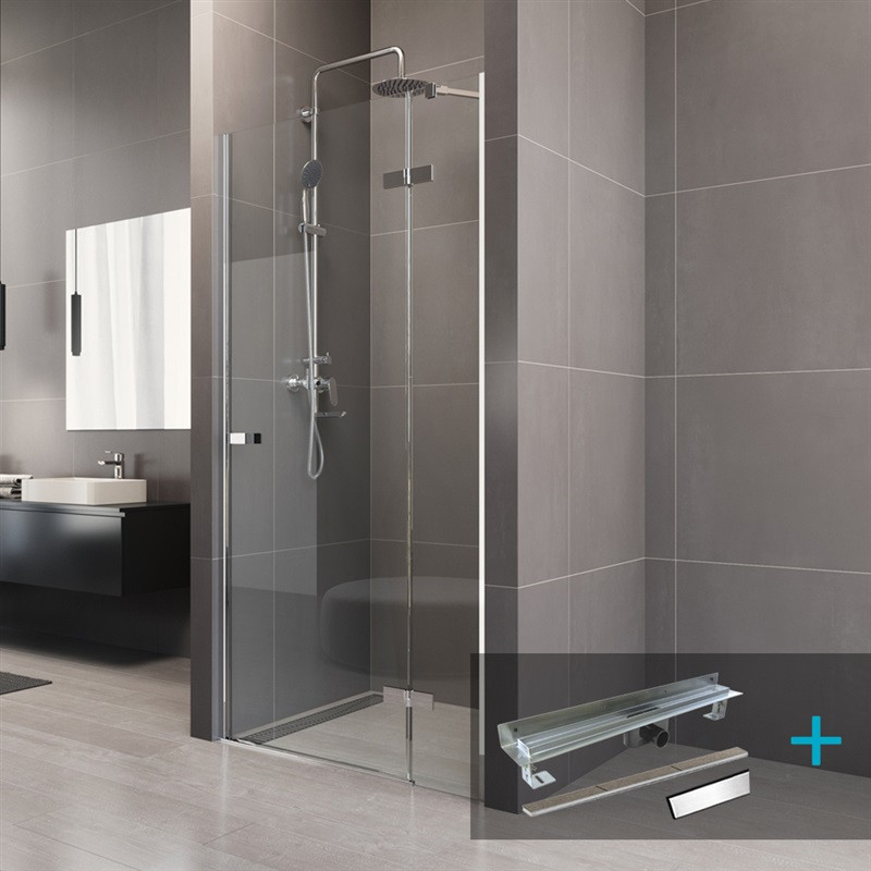 Sprchové dvere, Novea, 90x200 cm, chróm ALU, sklo Číre, pravé prevedenie, nerezový žlab k stene