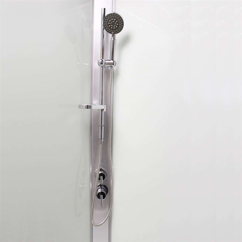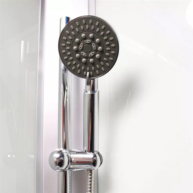 - Sprchový box, štvrťkruh,100cm, satin ALU, sklo Point, zadne steny biele, liatá vanička, bez striešky