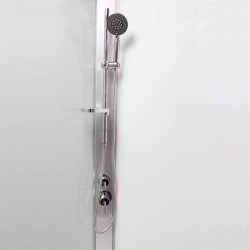 - Sprchový box, štvrťkruh,100cm, satin ALU, sklo Point, zadne steny biele, liatá vanička, so strieškou