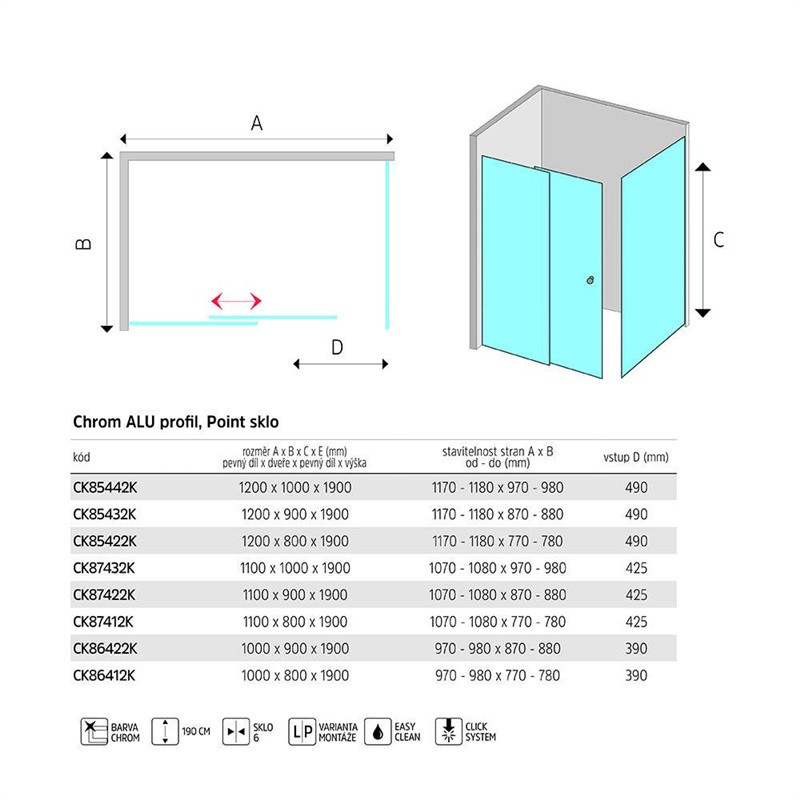 Sprchový kút, Lima, obdĺžnik, 110 x 90 cm, chróm ALU, sklo Point