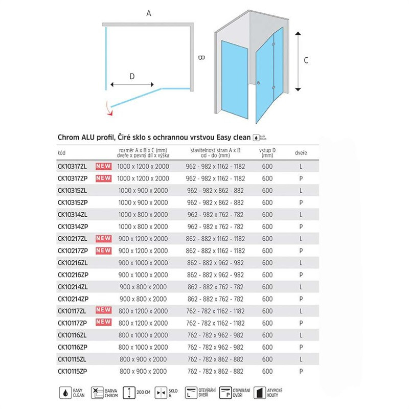 Hliníkové profily vo farbe chróm, sklo Číre, hrúbka skla 6/6 mm, obdĺžnik, rozmer 800x900 mm, výška 2000 mm.