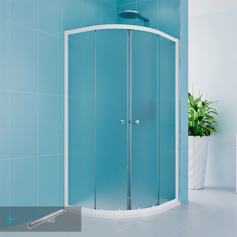 Set štvrťkruhového sprchovacieho kúta 900 x 900 mm, výšky 1850 mm, hrúbky skla 4 mm a odtokového žľabu