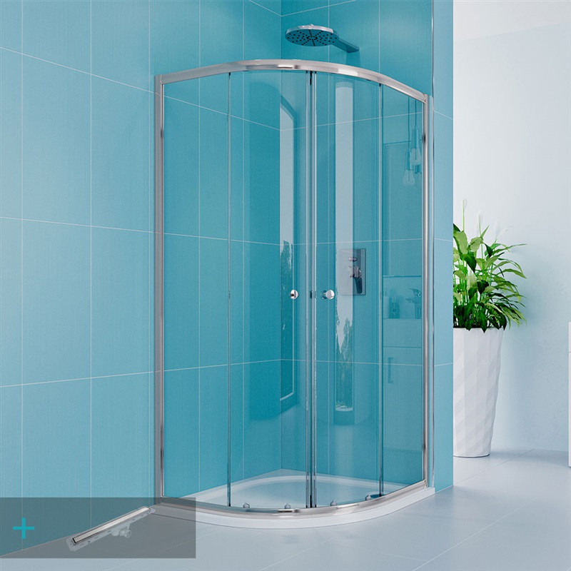 Set štvrťkruhového sprchovacieho kúta 900 x 900 mm, výšky 1850 mm, hrúbky skla 4 mm a odtokového žľabu