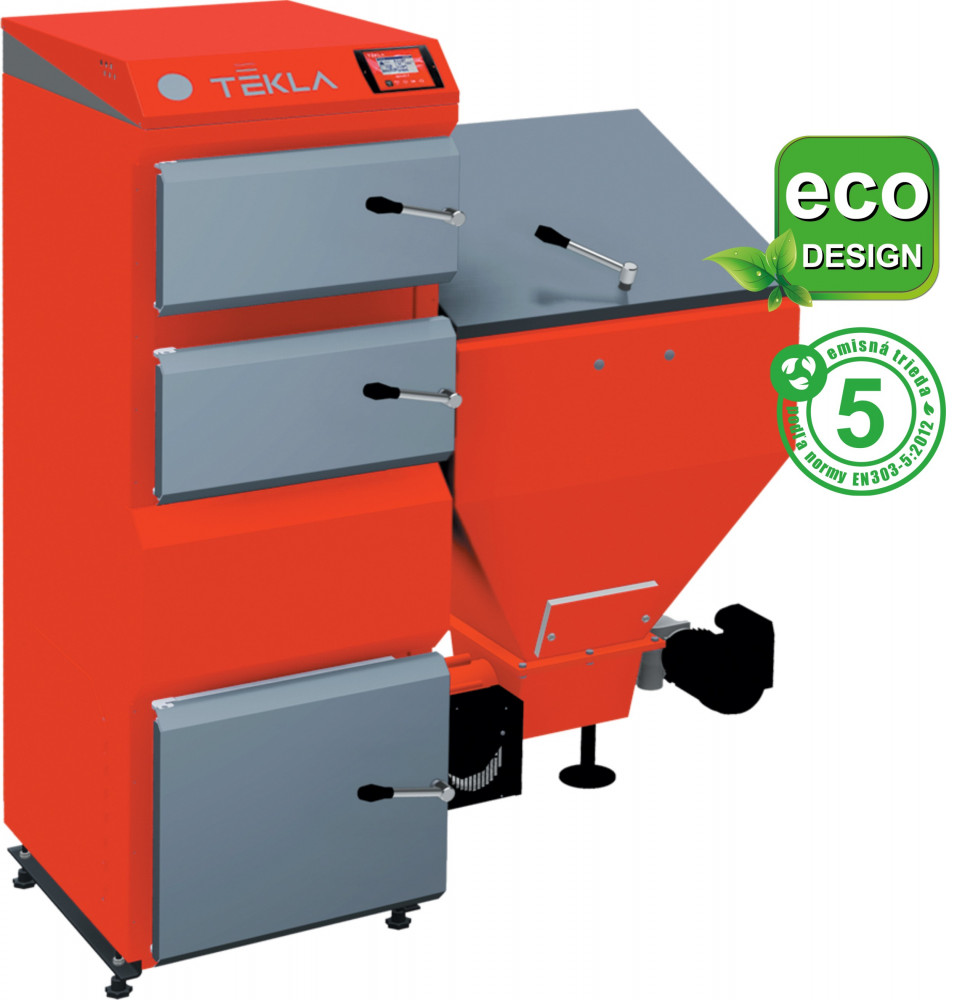 TEKLA, oceľový jednoohniskový kotol s automatickým horákom na pelety DRACO 35, so šnekovým podávačom paliva a horákom na pelety, s plne automatickou prevádzkou.