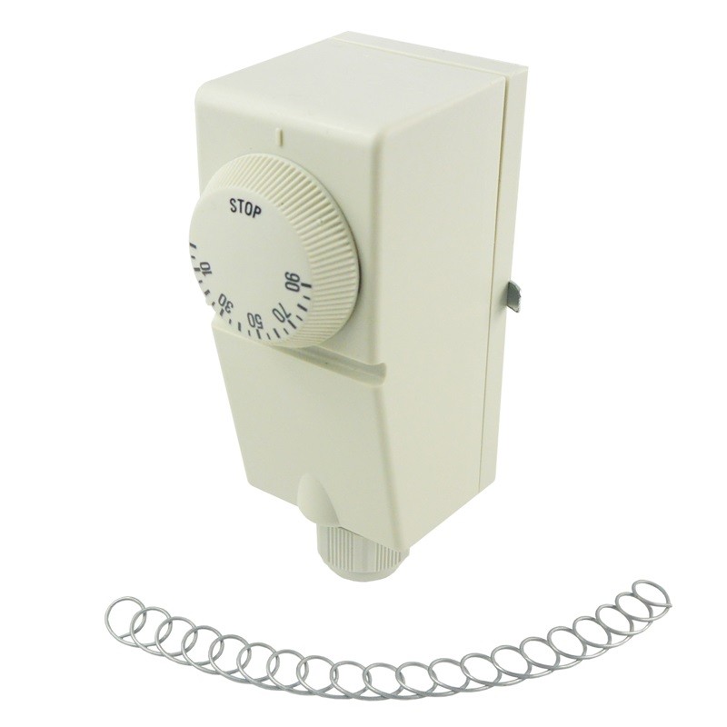 Príložný termostat slúži k nastaveniu požadovanej teploty vody v potrubiu. Pri dosiahnutí teploty termostat spúšťa obehové čerpadlo.Termostat je priložený na potrubie je uchytený po obvode pružinou, ktorá je súčasťou balenia. Termostat má prepínací kontakt a možno ho využiť na vykurovacie aj chladiace systémy. Rozsah riadenie teploty: 0-90 °C. Presnosť teploty +/- 3 °C.