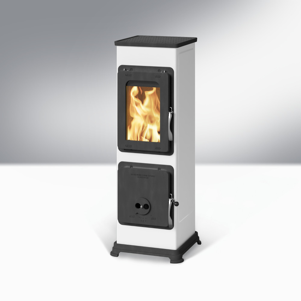 Krbové kachle THORMA BOZEN AT v bielom prevedení. Prinášajú príjemné sálavé teplo, veľké presklené dvierka pre krásny výhľad na plameň a spoľahlivý výkon pre vykurovanie obytných priestorov.