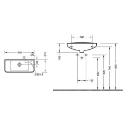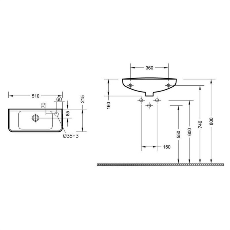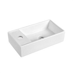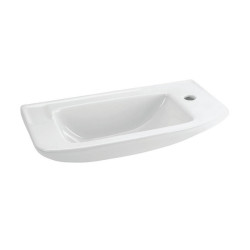Keramické umývadielko s otvorom na batériu iba na pravej strane a s prepadom. Možnosti inštalácie na zavesenie.