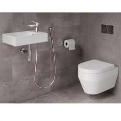 Rad vodovodných batérií Eve vyniká spojením elegantného tela a tvarovo jednoduché a napriek tomu efektné páky. Táto batéria navyše obsahuje bidetovú spŕšku pre intímnu hygienu, dlhú hadicu a praktický držiak na stenu.