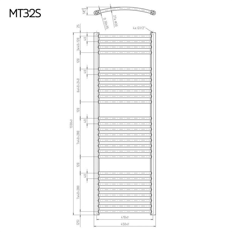 - Vykurovací rebrík, oblý, 450x1330 mm, biely, stredové pripojenie