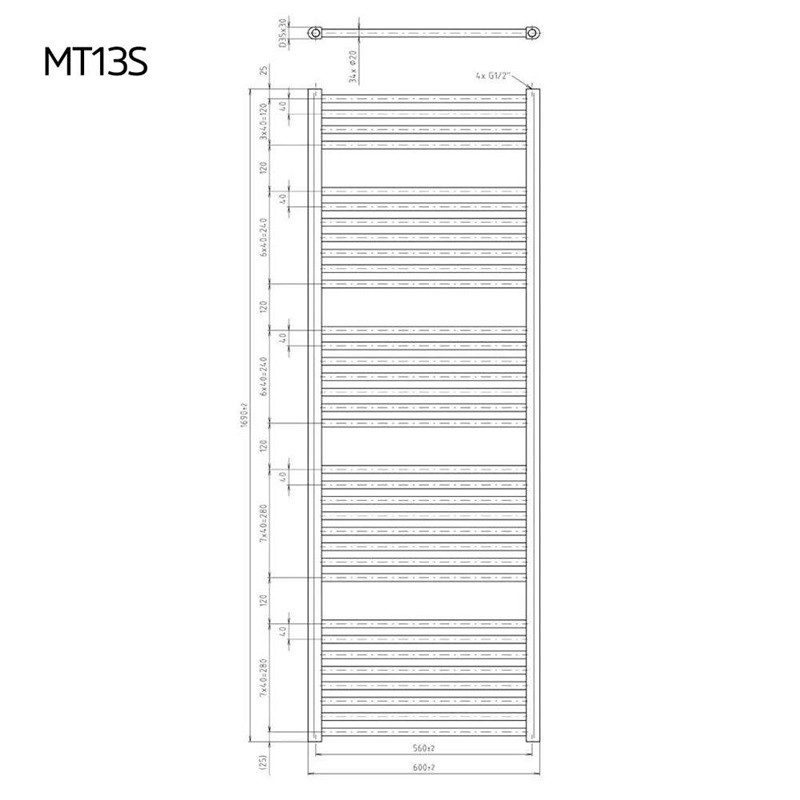 - Vykurovací rebrík, rovný, 600x1690 mm, biely, stredové pripojenie