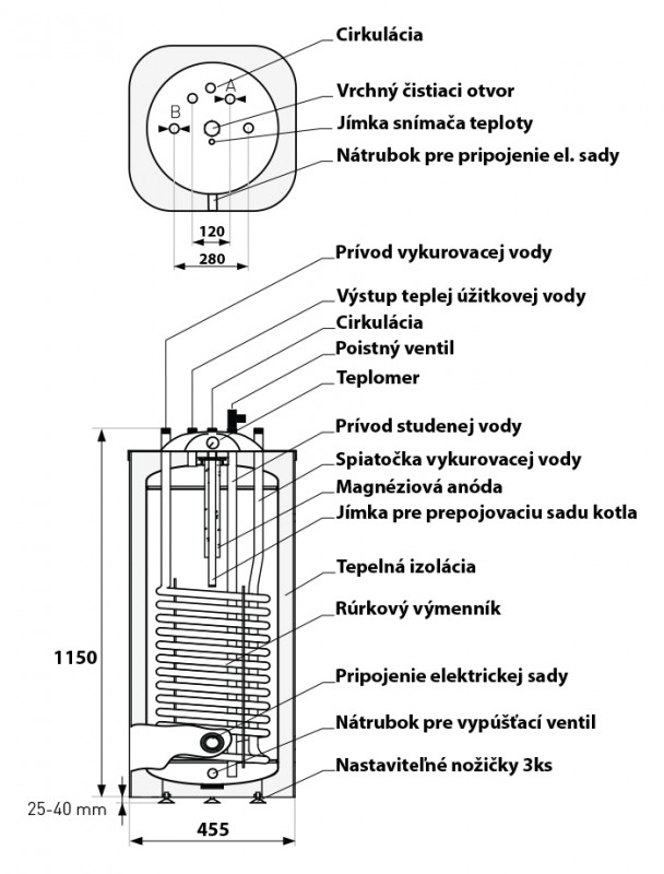 - nátrubok v spodnej časti pre montáž elektrickej vykurovacej špirály 5/4" (špirála nie je súčasťou dodávky)